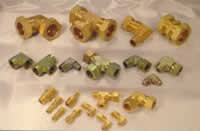 Conexões e Adaptadores de uso geral, como Tampões, Niples e Uniões laminados em aço baixo carbono ASTM A-576 12L14 ou trefilados de latão CLA UNS-C36000-TM, Cotovelos, Tees e Cruzetas forjadas em aço baixo carbono ASTM A-576 12L14 ou em latão UNS-C 37700-TM Carbono fabricados sob consulta.